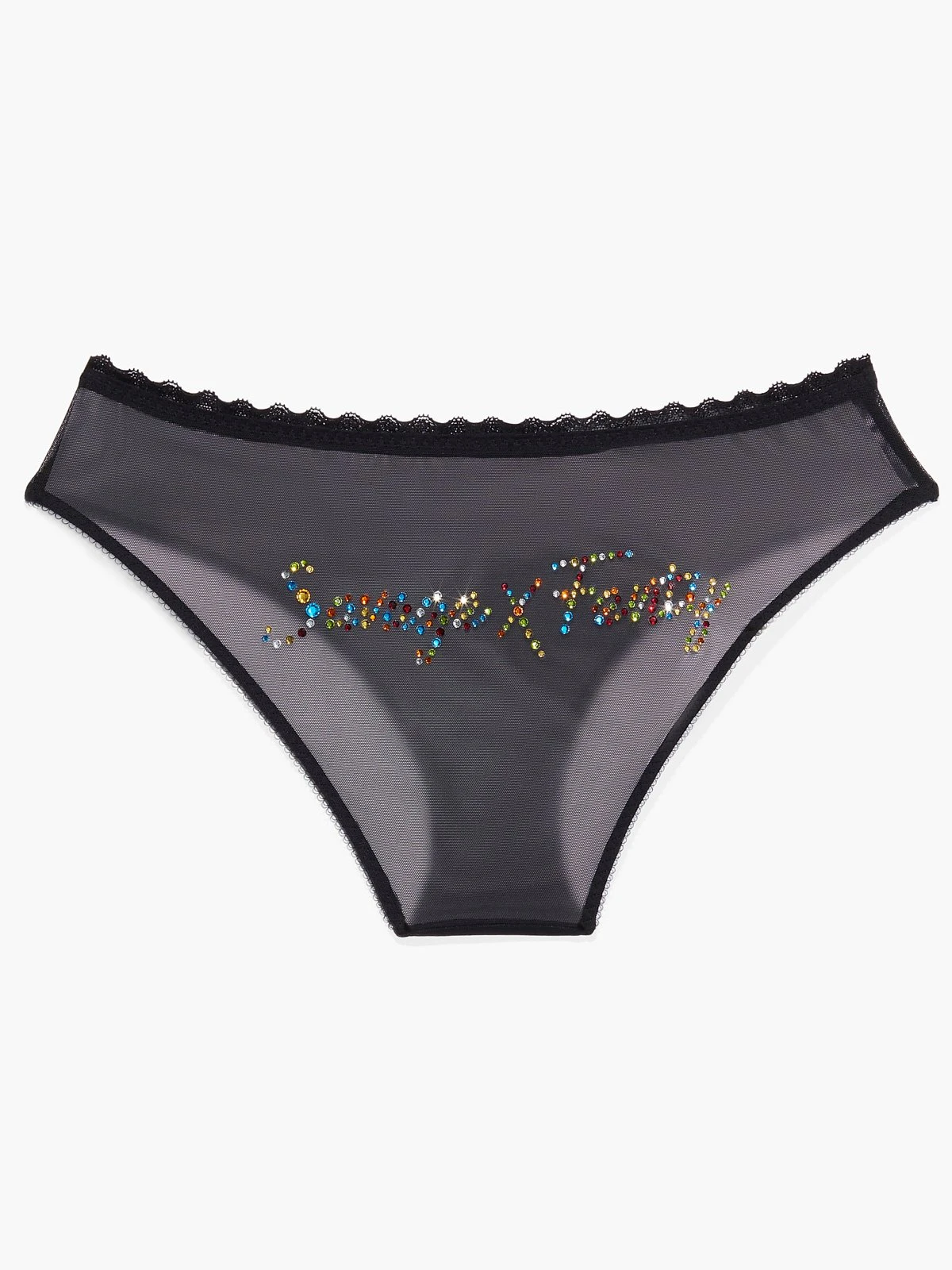 Mach Dich bereit zum Feiern! Unser Carnival Cheeky ist aus transparentem Mesh-Stoff und hat ein Logo aus Regenbogen-Steinen auf der Rückseite.
