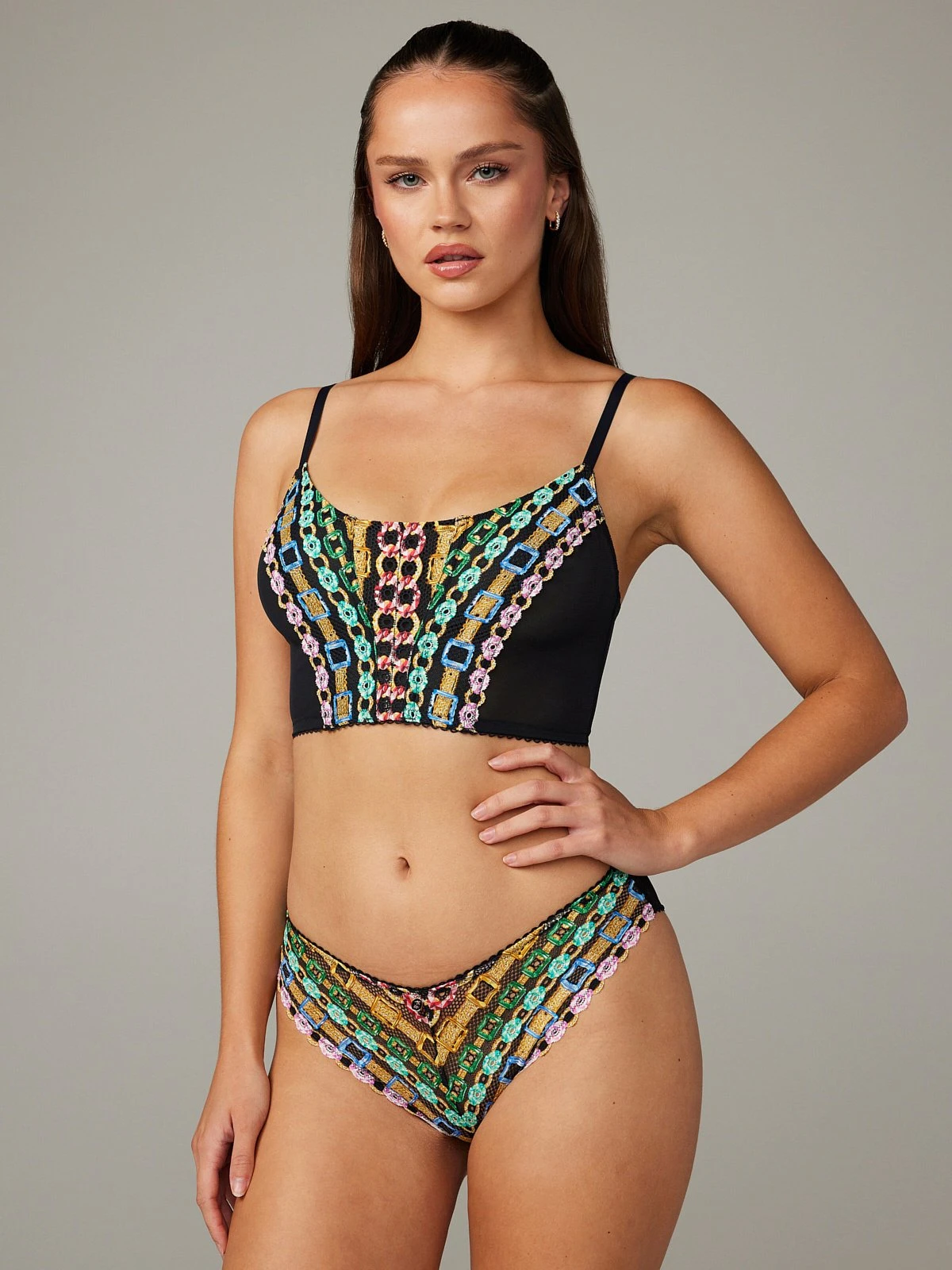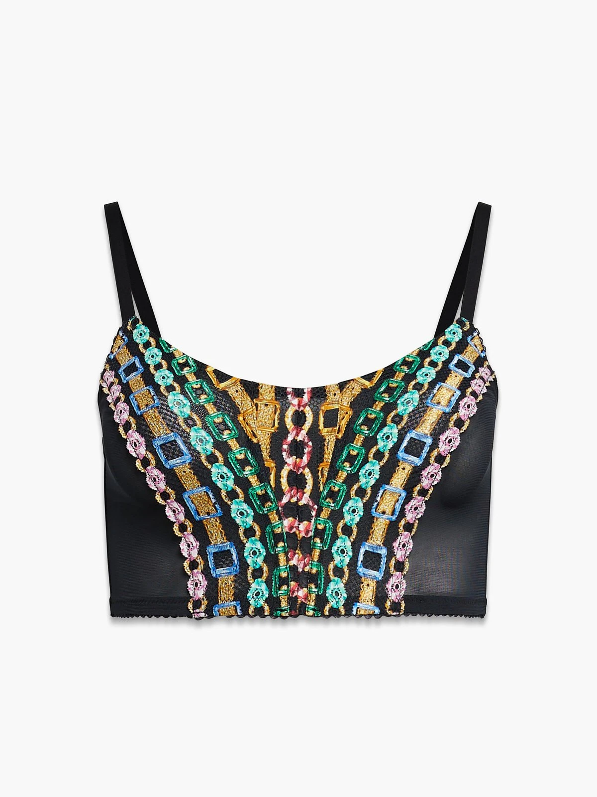 Unser Chained In Lace Bustier ist aus personalisierter Spitze mit Kettendruck und transparentem Power-Mesh, hat verstellbare Träger und rose-goldene Details.