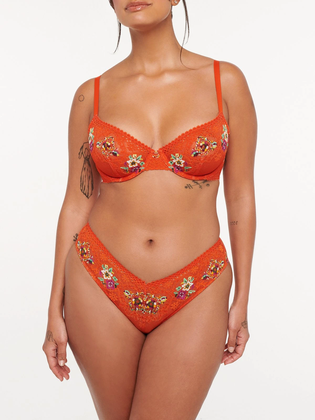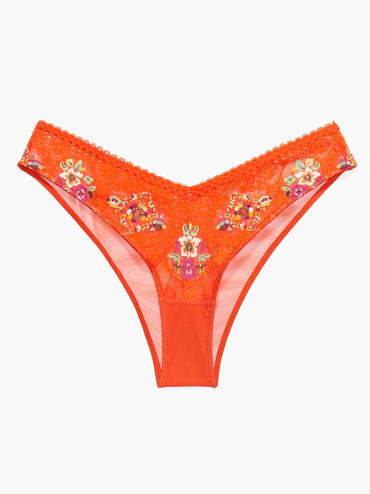 Regeln sind zum brechen da! Unser Our Dolled Up Lace Brazilian ist aus baumwollähnlicher Spitze mit floralem Print gemacht und hat eine V-Taille für tiefe Blicke.