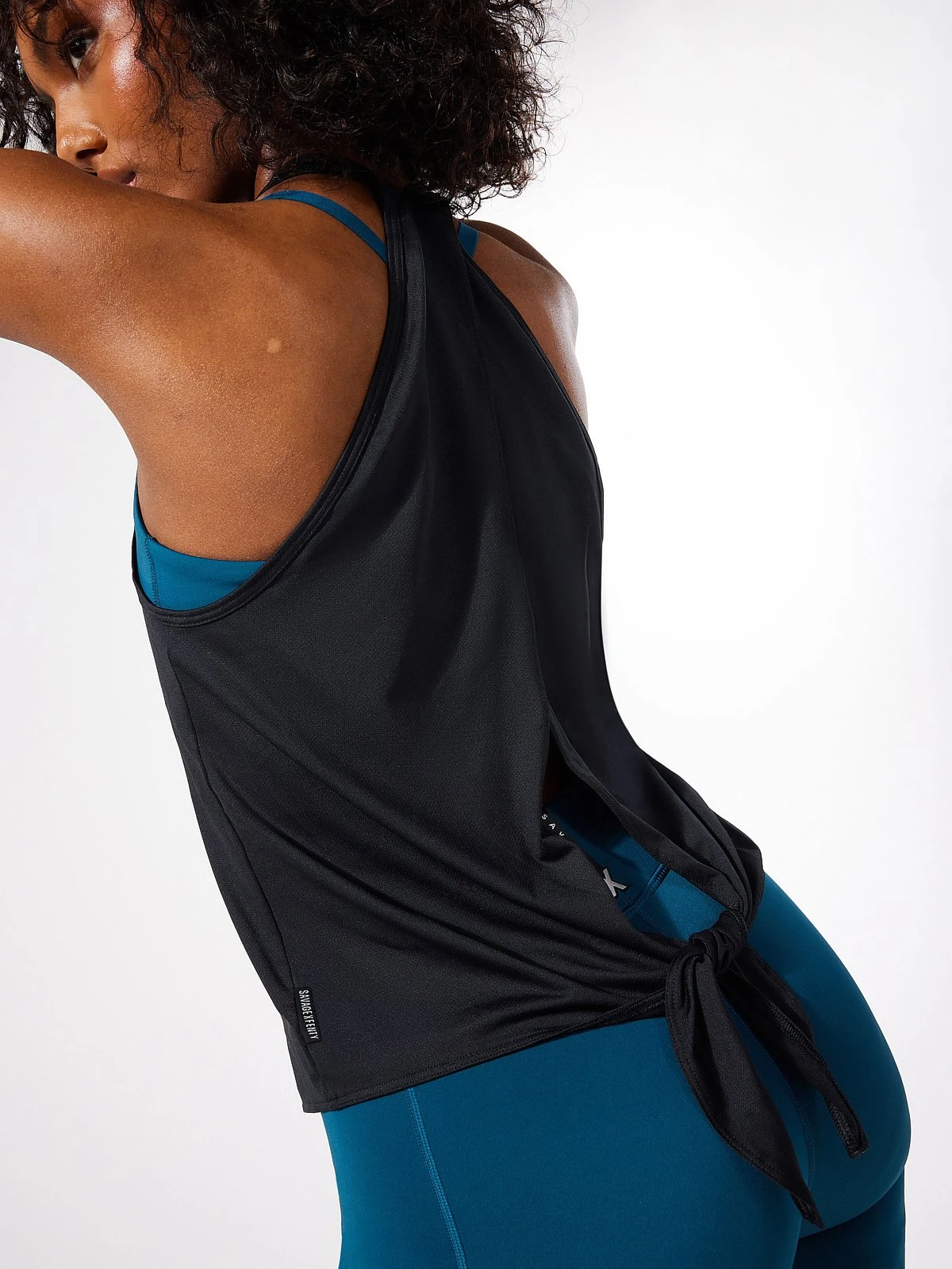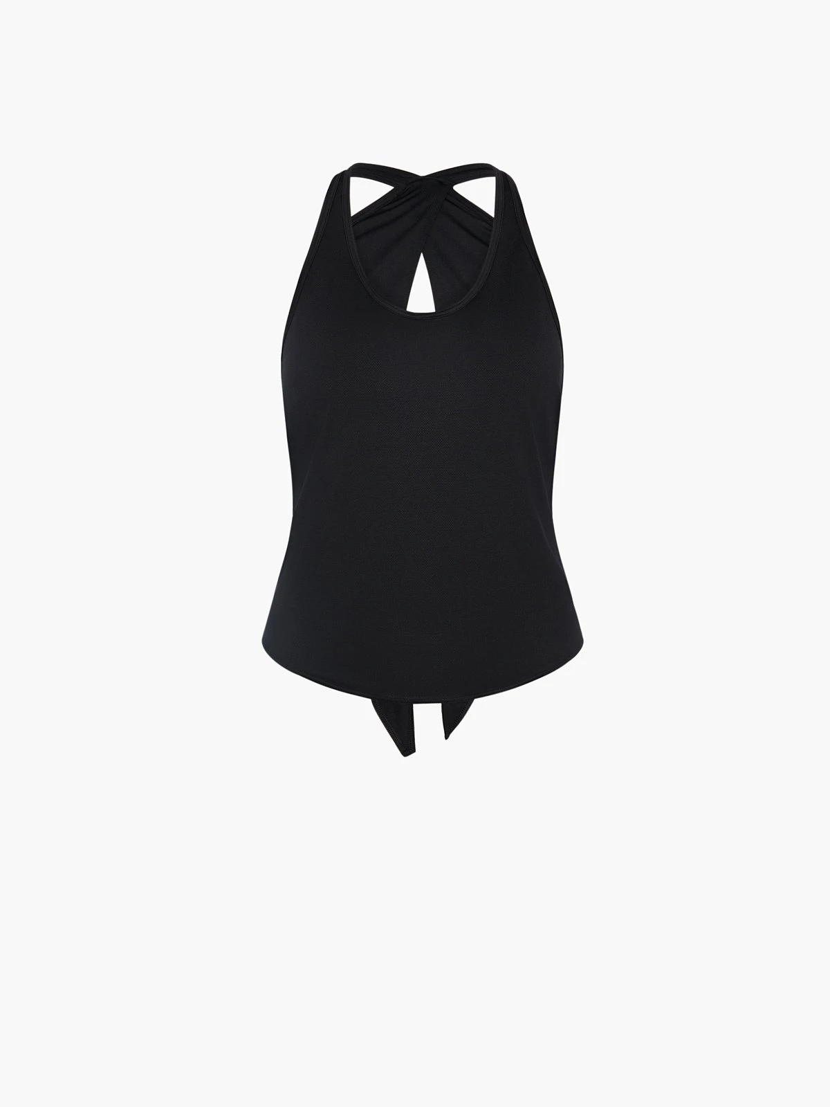 Our Light Layer Open-Back Tank features smooth jersey fabric, a keyhole cutout, and an adjustable tie at the lower back.