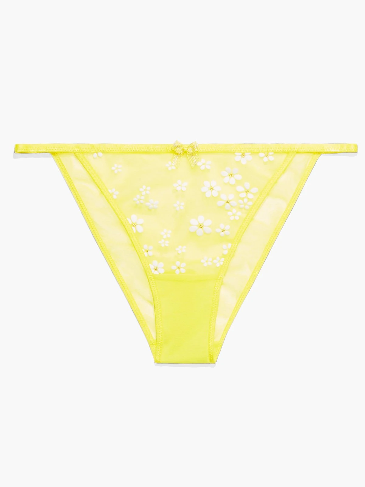 Unser Puff Daisy String Bikini ist aus transparentem Material und hat eine strukturierte GĂ€nseblĂŒmchen-Stickerei.