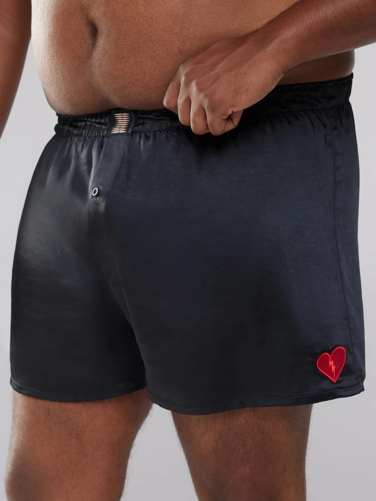 Jeder Rebell braucht etwas Romantik! Unsere Rebel Cherub Satin Boxers haben ein gebrochenes Herz aufgestickt und einen elastischen Bund mit unserem Logo.