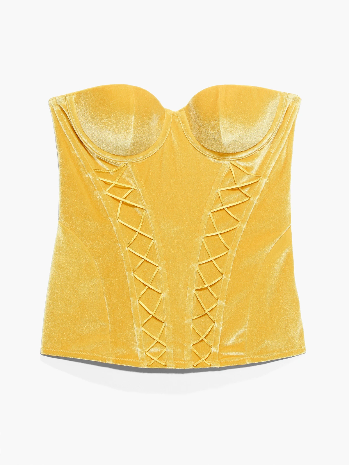 Nichts ist süßer als Luxus. Unser Velvet Vixen Corset aus Samt ist trägerlos, hat gefütterte Balconette-Körbchen und macht Dich zum Star der Show.